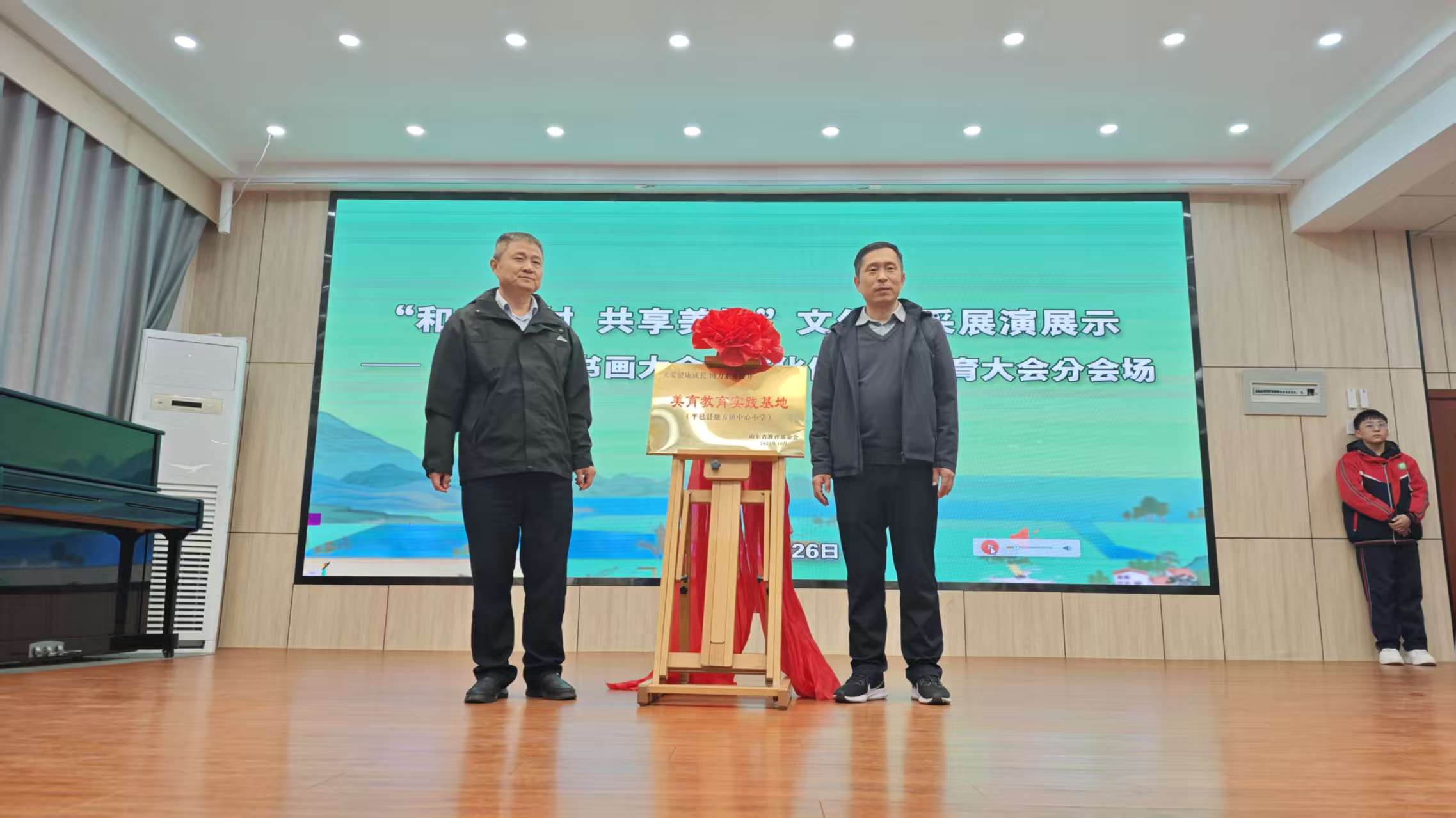 郑吉刚向地方镇中心学校颁发“山东省教育基金会美育教育实践基地”牌匾。