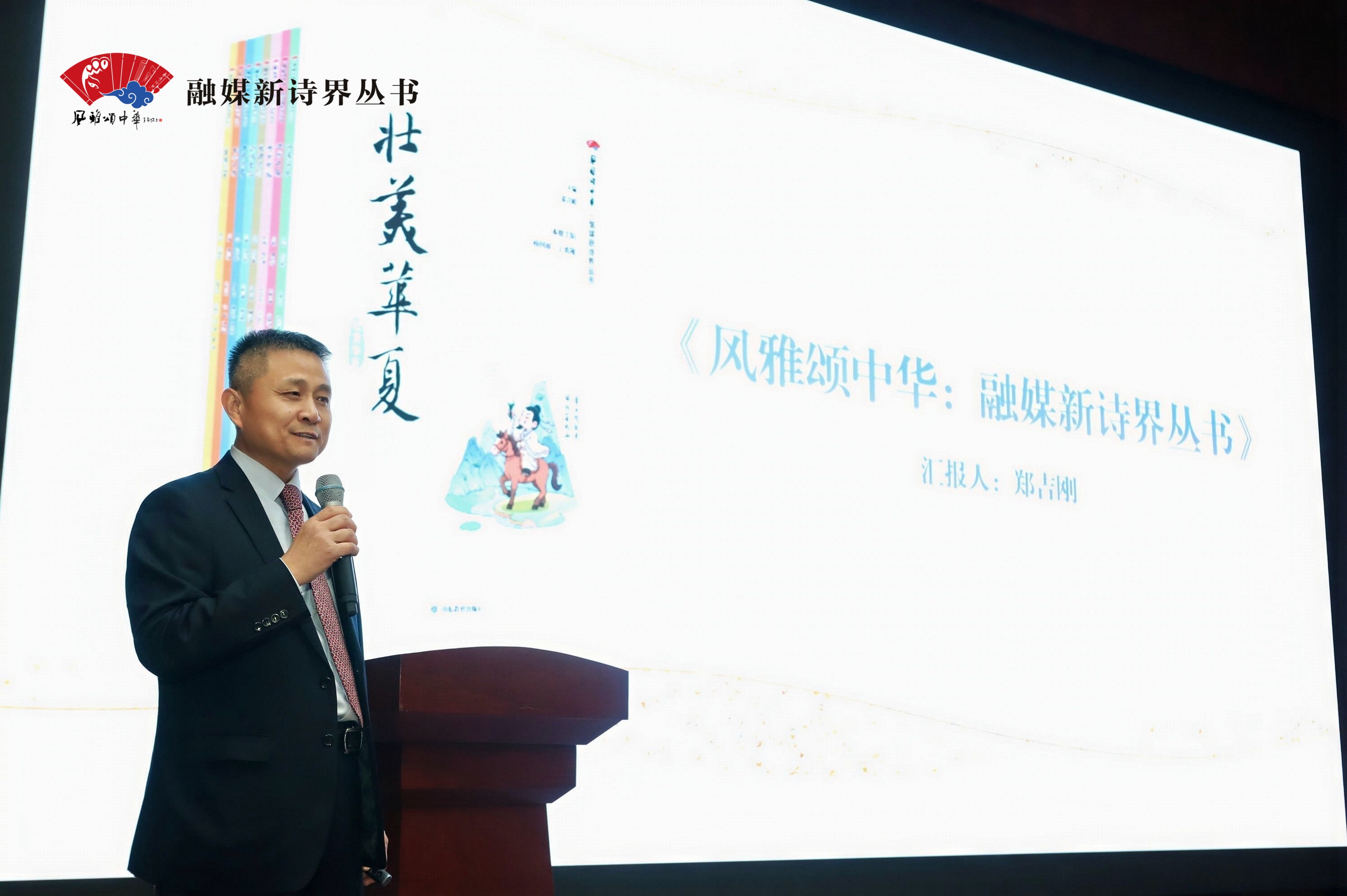 郑吉刚详细介绍了《风雅颂中华:融媒新诗界丛书》历时六载,从创意萌芽、体系构建到融媒集成的系统化编创历程,并系统阐述了该丛书如何依托经典诗词,融合互联网、大数据和人工智能等现代科技,搭建起“人人可学、处处能学、终身易学”的文化平台。重点演示了书中独特的“二维码”入口:使诗词不再局限于文字呈现,而是借助科技手段打造沉浸式视听体验,让浸润墨香的诗词突破纸质边界——既可聆听名家解读,也能观看气象专家科普二十四节气、中医药文化智慧等内容,更能沉浸于朗诵、戏剧等丰富的视听演绎,真正实现从“阅读”到“体验”的跨越。这套丛书具有可持续、可拓展的广阔空间,将持续走进千家万户、企事业单位及学校课堂,建立悦读空间,融入每个热爱传统文化的中国人的生活;同时将正式启动第二版书画作品征集与诗词才艺类视频演绎征集活动。标志着丛书从单一出版转型为开放、共生、共创的公共文化场景化平台,呼吁更多文化机构、名师名家、学者及传统文化爱好者参与其中,共同助力中华优秀传统文化在当代的创造性传播与创新性发展。