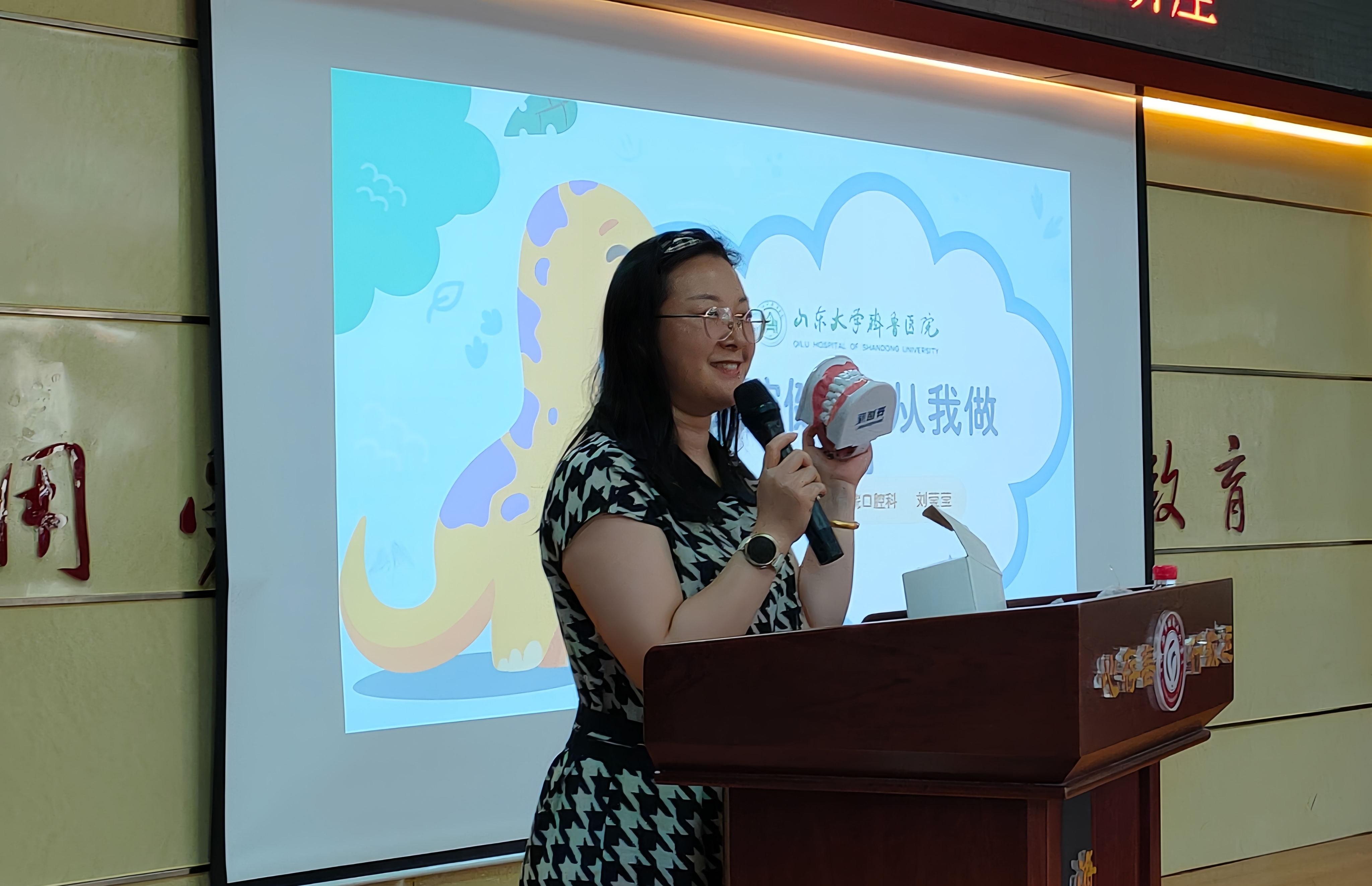 启动仪式后活动分为两个平行环节,山东大学齐鲁医院眼科主治医师尹世达为师生作《青少年近视防控科普》专题讲座,讲述从科学用眼、远离电子屏幕依赖到户外运动的重要性,帮助同学们筑牢视力防护墙。国际医疗部主管护师周倩讲解《青少年牙齿护理科普》知识。山东大学齐鲁医院国际医疗部主管护士安丰帅、周倩以《口腔健康从我做起》为主题,通过演示正确刷牙方法、解读饮食习惯对牙齿的影响,让健康口腔成为自信人生的起点。现场学生踊跃参与,讲座内容贴近实际需求,赢得师生一致好评。