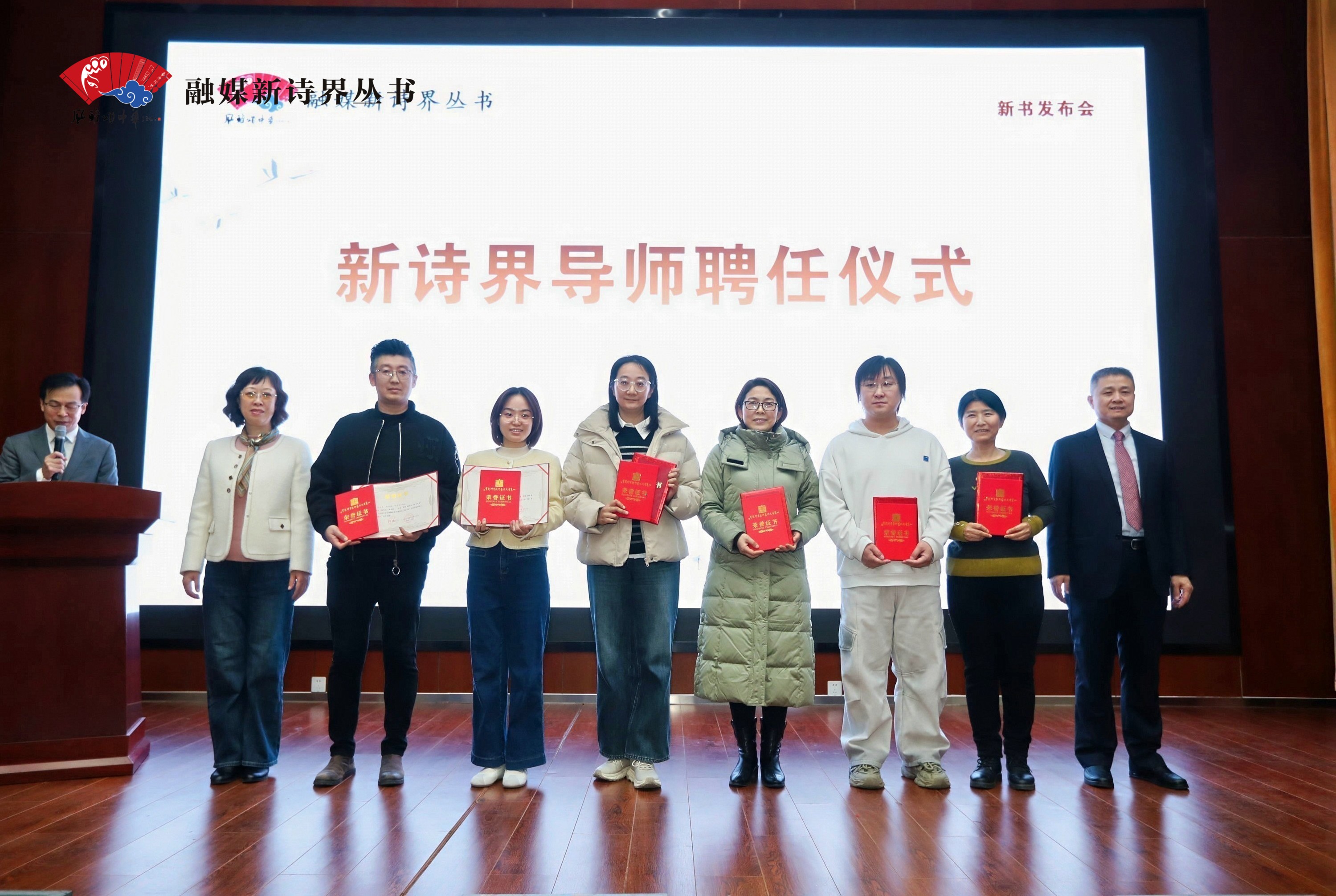 盛春岩、郑吉刚向陆桂荣、张莹、张芹、苏莉莉、翟欣瑀、陈彬颁发“新诗界导师”聘任证书。