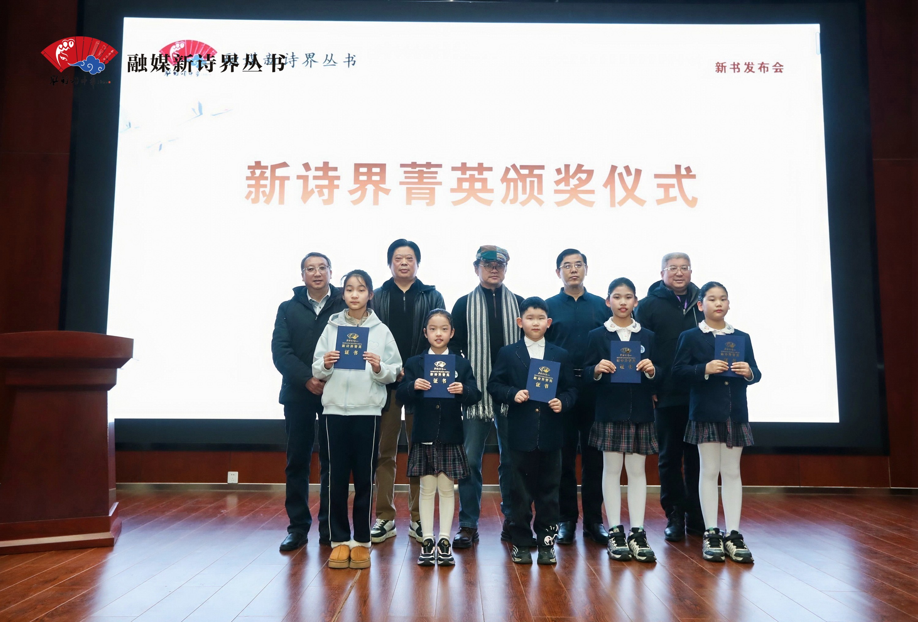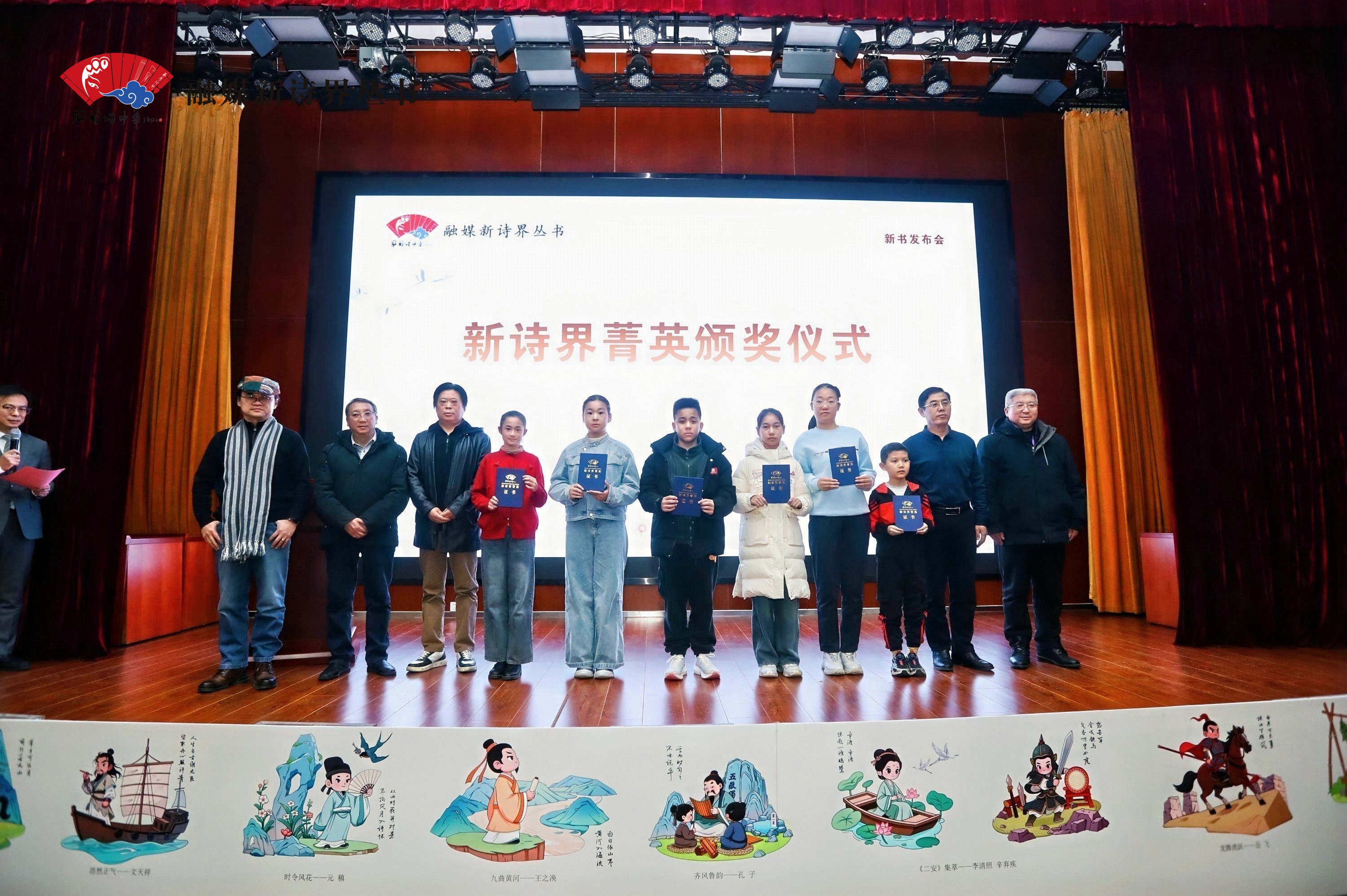 李旭昊、董庆峰、沈瑶琴、傅海珠、侯博瀚为小作者们颁发“新诗界菁英”证书。获得该荣誉的小作者经培训后,将被授予“青春领读者”等称号,并可参加一次以黄河文化、中医药文化或气象科普等为主题的研学或阅读实践活动。符合要求的才艺展演作品或视频,将通过大众网·海报新闻及《风雅颂中华:融媒新诗界丛书》专属平台进行矩阵式推广。