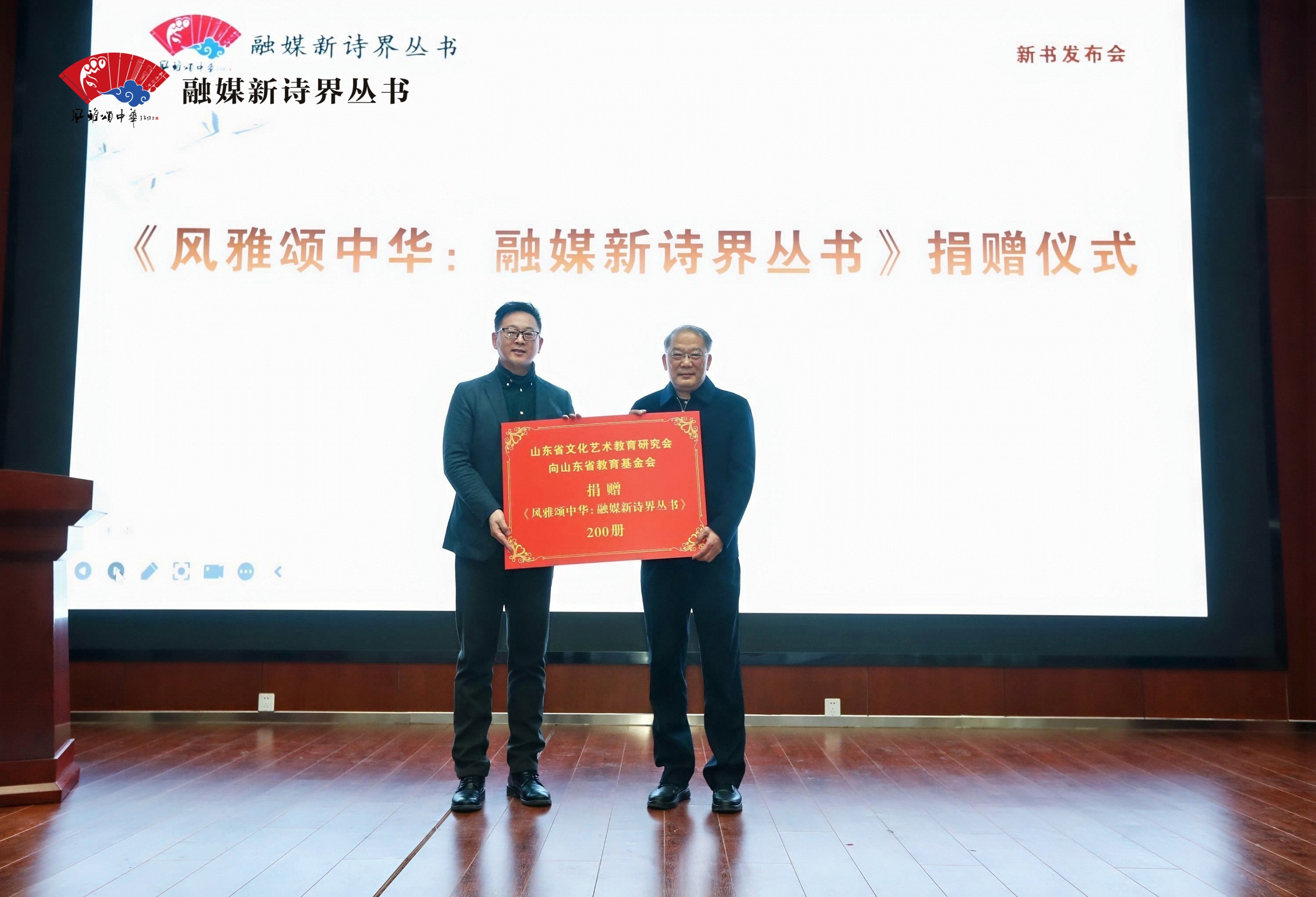 山东省文化艺术教育研究会向山东省教育基金会捐赠《风雅颂中华:融媒新诗界丛书》200册。刘欣堂与杨三军共同启动丛书捐赠仪式暨“以文化传爱心,以公益践初心”义卖活动。